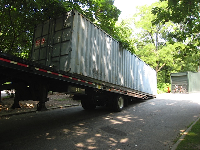 Thanks to the efforts of VCB’s Rob Buchanan, there is a new VCB boathouse in Prospect Park. The boathouse is actually a shipping container which the Parks Department requires to be painted parks department green. We almost got it right but the painting party was cut short by the rain.The plan is to fill the shipping container with our small boats and offer public and high school rowing on Prospect Park Lake, starting in mid-July. It’s a bit of a hike from the container to the launch ramp–about 200 yards–but with the right dollies it should be fairly easy to get the fleet to the water.