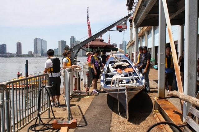 The first step to rowing, it turned out, was a complicated process of lowering a 25-foot wooden boat fifteen feet down from the pier to the water. By the time the crew was assembled in the gig, my pin and ring set, my oar tossed, I felt I’d already received an advanced degree in nautical language. We pulled away from the pier and took a turn around the “cove,” the protected water between the hulking mass of Pier 40 (gently crumbling into the river) and the iconic ventilation stack of the Holland Tunnel.
