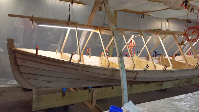 We glued on the outwales Sunday. It’s looking more and more like a boat! Work is hard with no heat so Frank Cervi organized a crew of boatbuilders to build a tent to keep us a little warmer as we finish the still nameless gig.