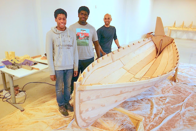 Here are some shots of the Benjamin Banneker Rowing Club assembling a 15-foot Whitehall rowboat at Building 92, the Brooklyn Navy Yard Museum and Visitors Center. The boat is roughly based on plans for a “New York Whitehall” that was built at the Navy Yard 150 years ago and is described in Howard Chappelle’s “American Small Craft.” Once finished and painted it will be used in VCB’s Prospect Park Lake rowing program this summer where families can take free boat rides, see their craftsmanship and learn more about the historical significance of this vessel.