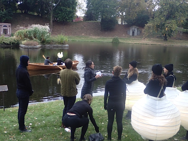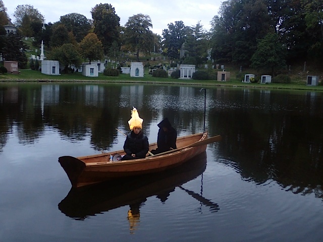 Last Saturday, Village Community Boathouse joined Atlas Obscura for a pre-Halloween event “Into the Veil.”at Greenwood Cemetery. The idea was to provide a variety of supernatural/creepy/odd/scary entertainment on the cemetery grounds— silent movies in the chapel; an avant-garde mambo band playing in the catacombs and an opera singer in a boat on the moonlit pond. That’s where VCB came in.