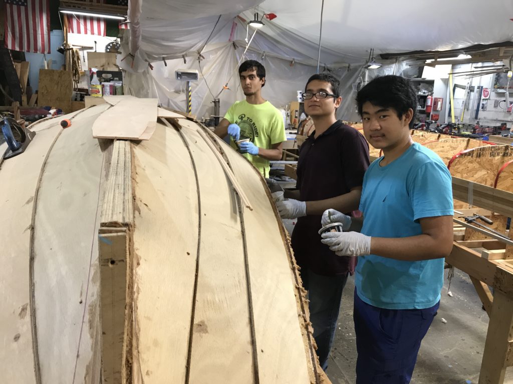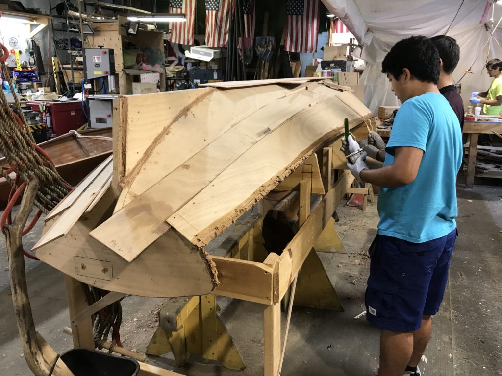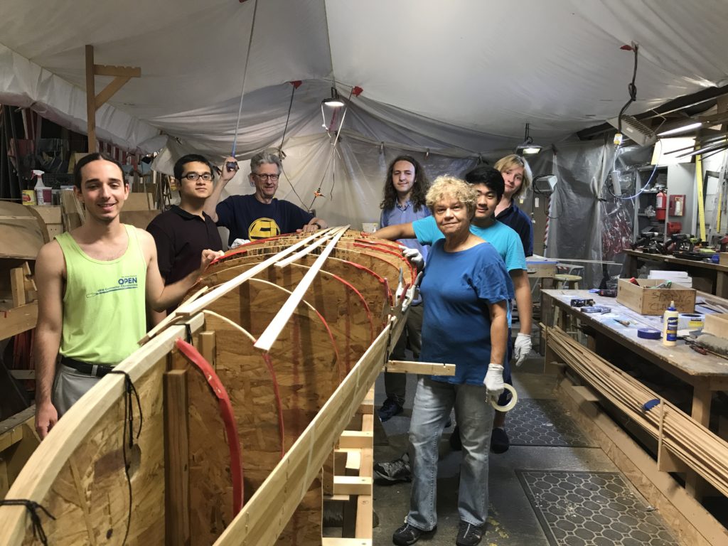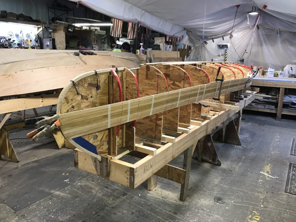 A small fleet of young boatbuilders joined Marcel and Ruth and Lorne on Wednesday afternoon at the VCB boathouse. With their help the Banneker rowboat got its sheer plank glued on, and the Traveler canoe saw the next four cedar strips find their places. The next boatbuilding session will be Sunday afternoon, Sept 3.