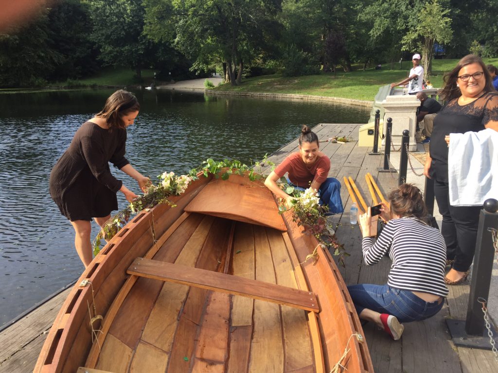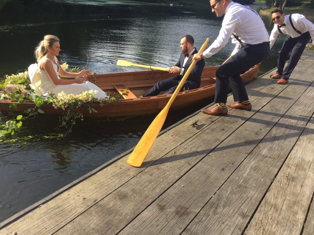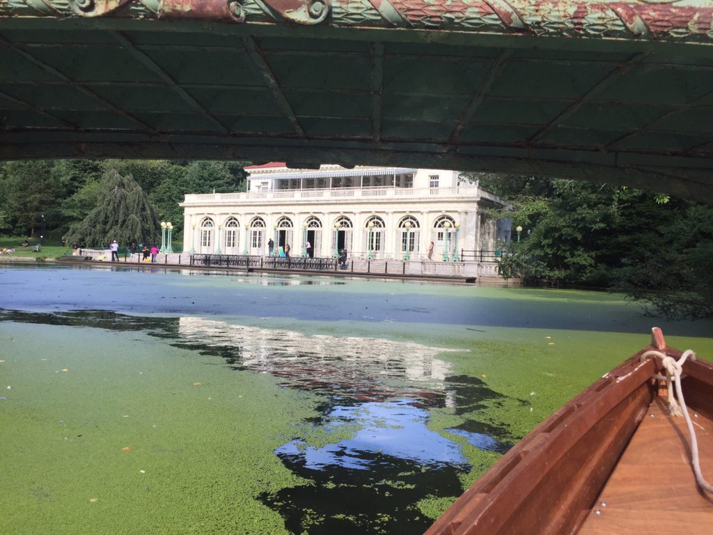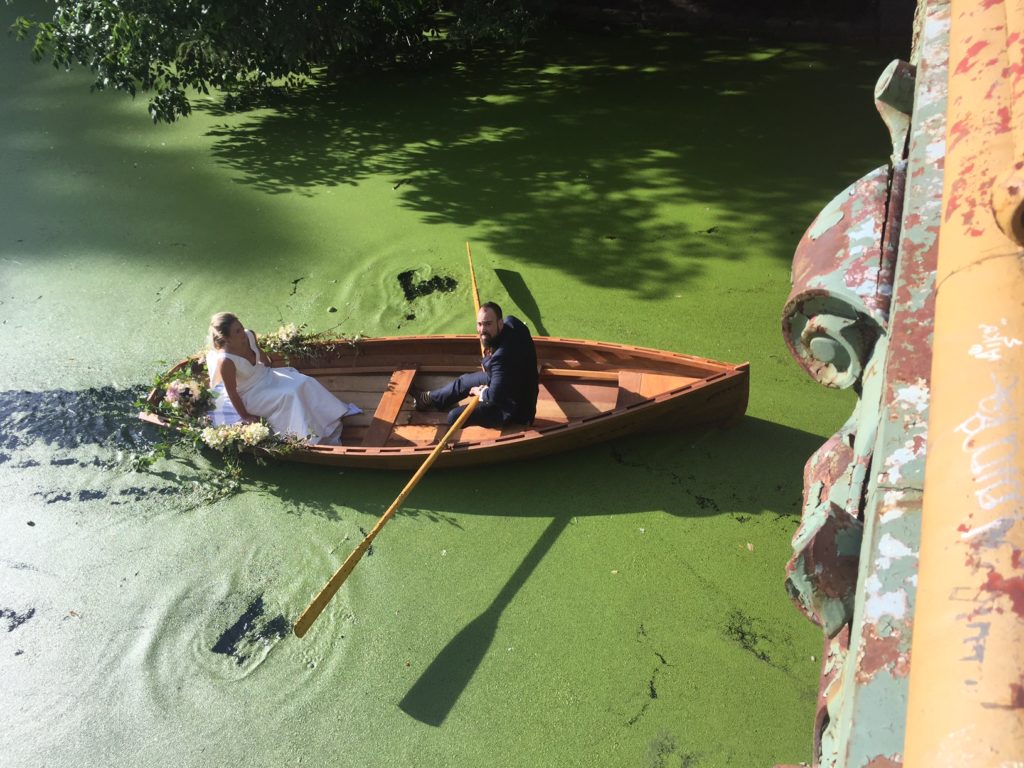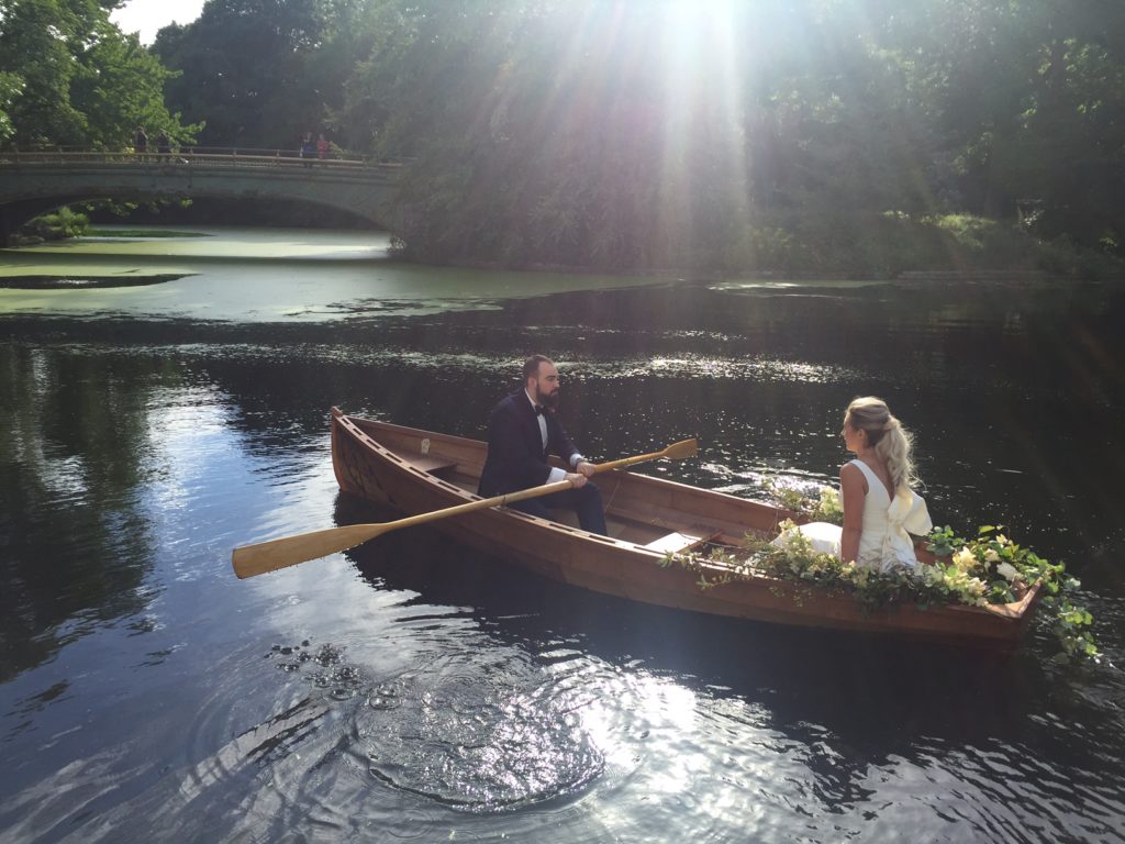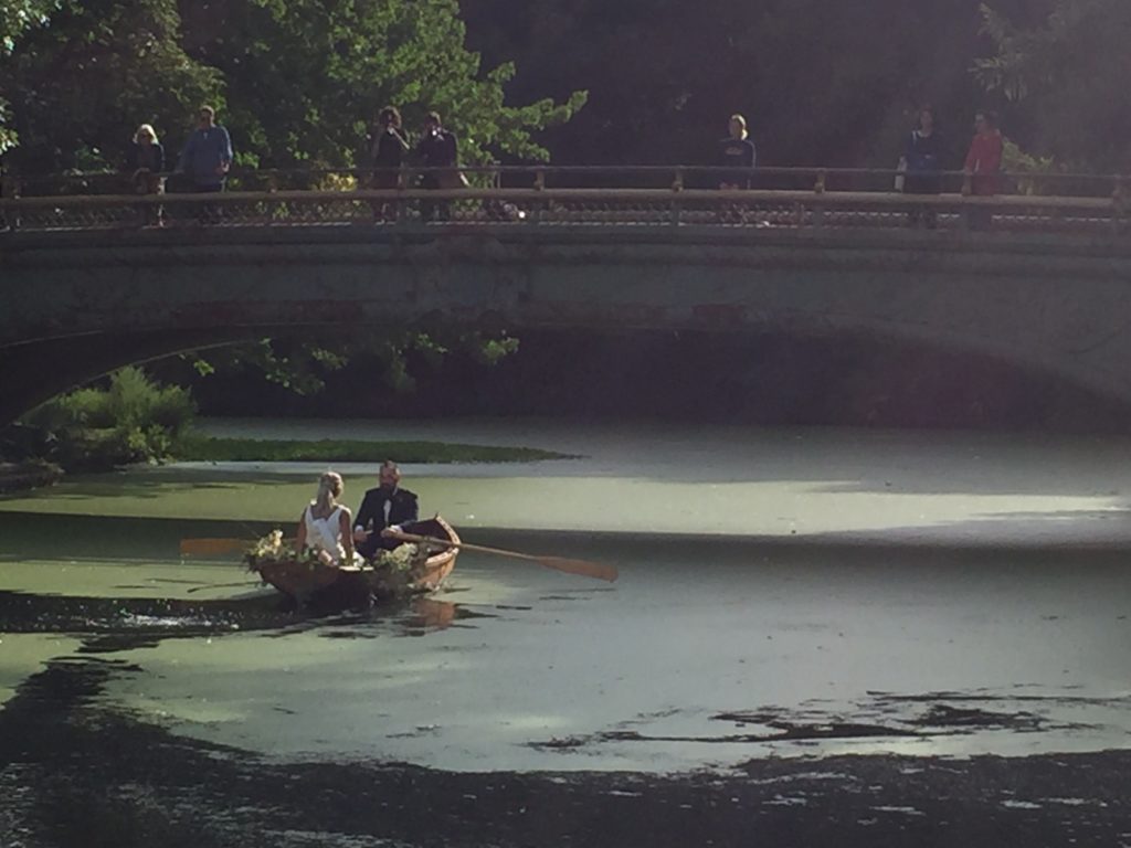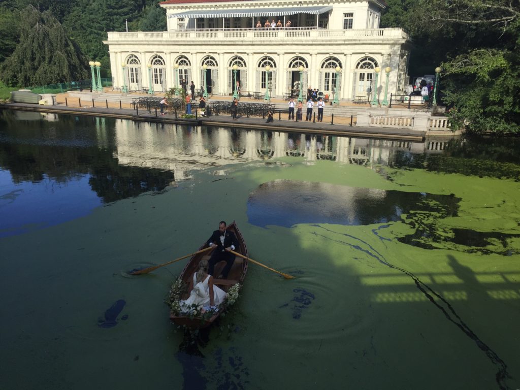 VCB’s season on Prospect Park Lake officially ended last Saturday, but we added one event by special request: a rowboat excursion for Jacinta Paulic and Mehmet Barlas, who were married yesterday at the Prospect Park Boathouse. The two had come out earlier in the summer to try out the boats; Mehmet’s rowing skills were shaky, and when the wind came up Jacinta had to row them back. But yesterday tradition won out and the groom took up the oars, manfully battling with the duckweed that has filled in the Lullwater, as that part of the lake is known. Congratulations to the newlyweds, who are off to South Africa on their honeymoon!