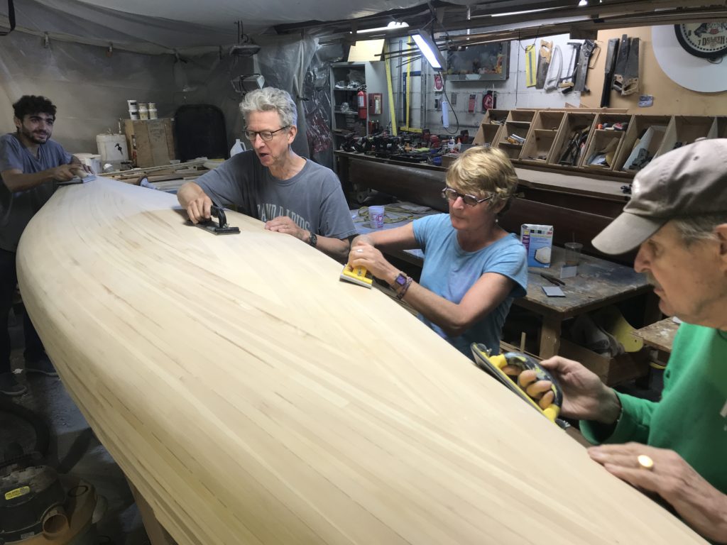 On Sunday afternoon the canoe hull was given more vigorous sanding to turn its faceted surface into a smooth cedar skin.