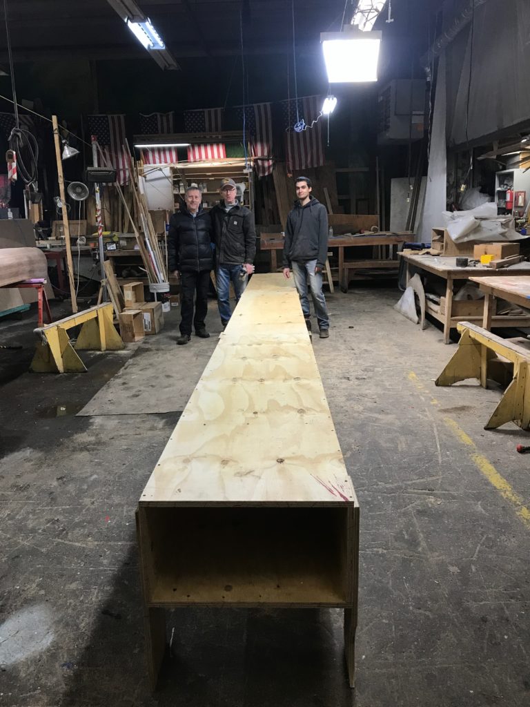 This “upside down” build is different than what we have done in the past, and we are excited/curious/cautious about how it will compare to building a boat “right side up.” A possible alternate use for this strongback has been suggested: as a runway for clothing models during the next Fashion Week.