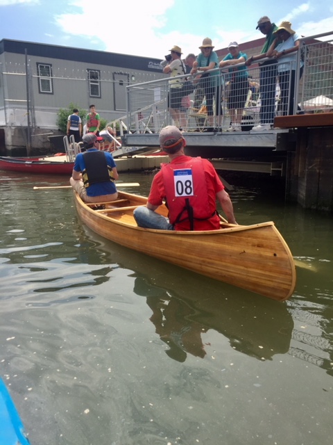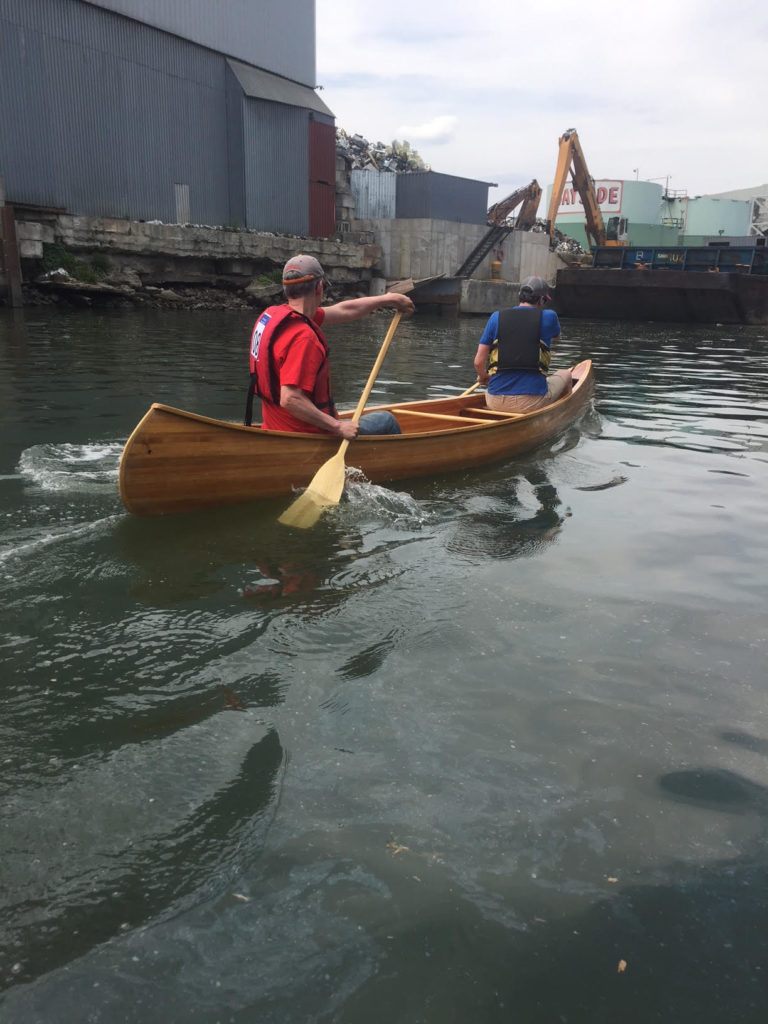 The Zoe came in first today in the Gowanus Challenge canoe race. Undaunted by the superfund waters of the Canal, Luke and I bent to our paddles and outpaced 10 red plastic Old Towns. We were happy that our beautiful cedar canoe was also the fastest canoe. First prize today was a metal crank dredged from the Canal bottom (?) and a bottle of Gowanus gin (!).