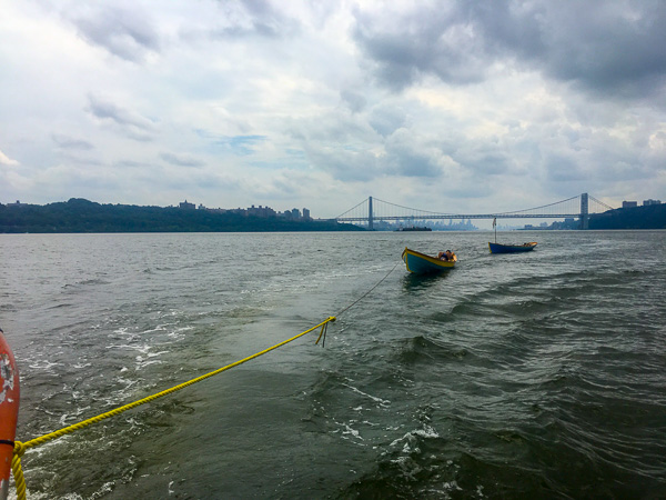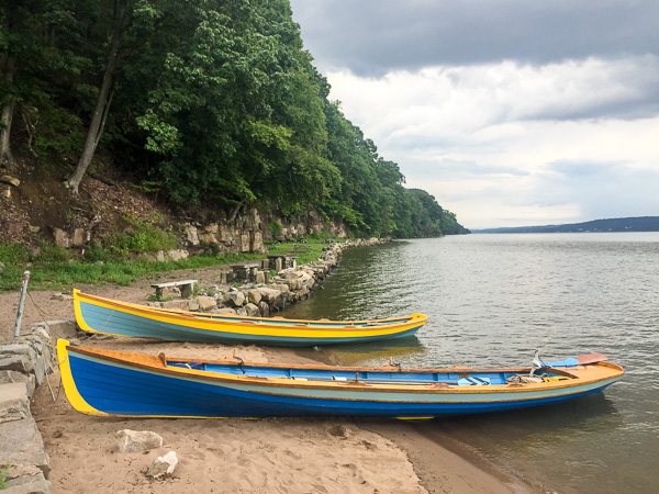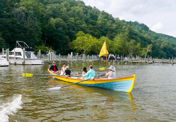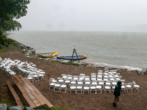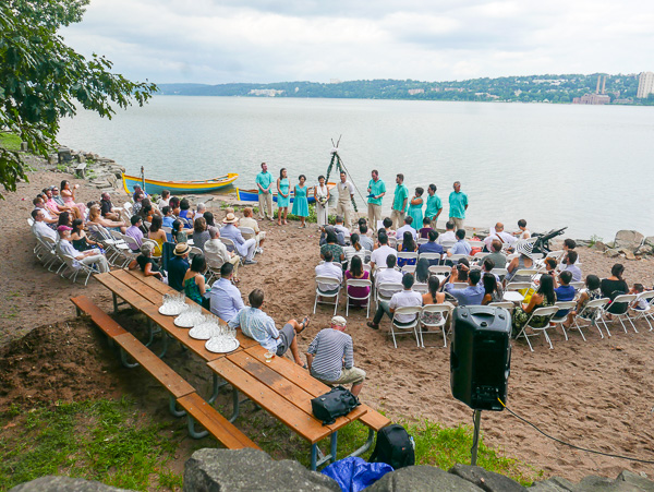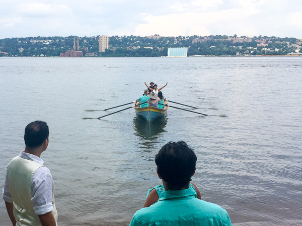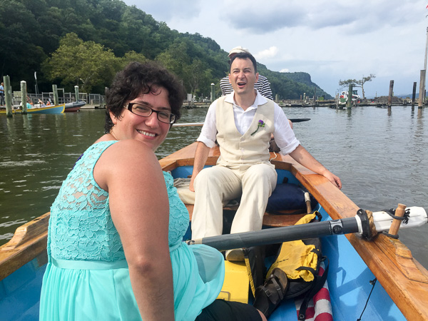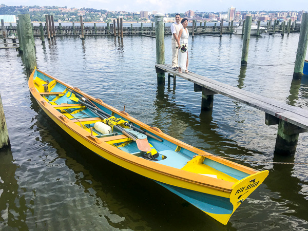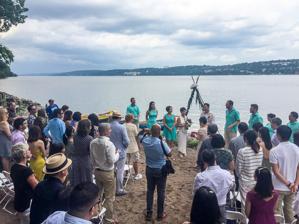 Ana Chiu and David Palsgrove were married on Saturday, August 18th on the beach at the Alpine Pavilion in Palisades Park, New Jersey beside the majestic Hudson River. The bride and groom are boat lovers and have supported the mission of the Village Community Boathouse for many years as volunteer program coordinators, coxswains, and rowers. So, it was no surprise to those who know and love them that Dave and Ana invited the VCB crew and two Whitehall Gigs to the ceremony. The bride and groom arrived at the beach in two separate gigs-The groom arrived first and waited with the wedding party for his bride. Rather than walk down the aisle, Ana was rowed down the river to meet her Dave on the beach. They exchanged vows and the party moved into the pavilion just as it began to rain. Perfect timing!