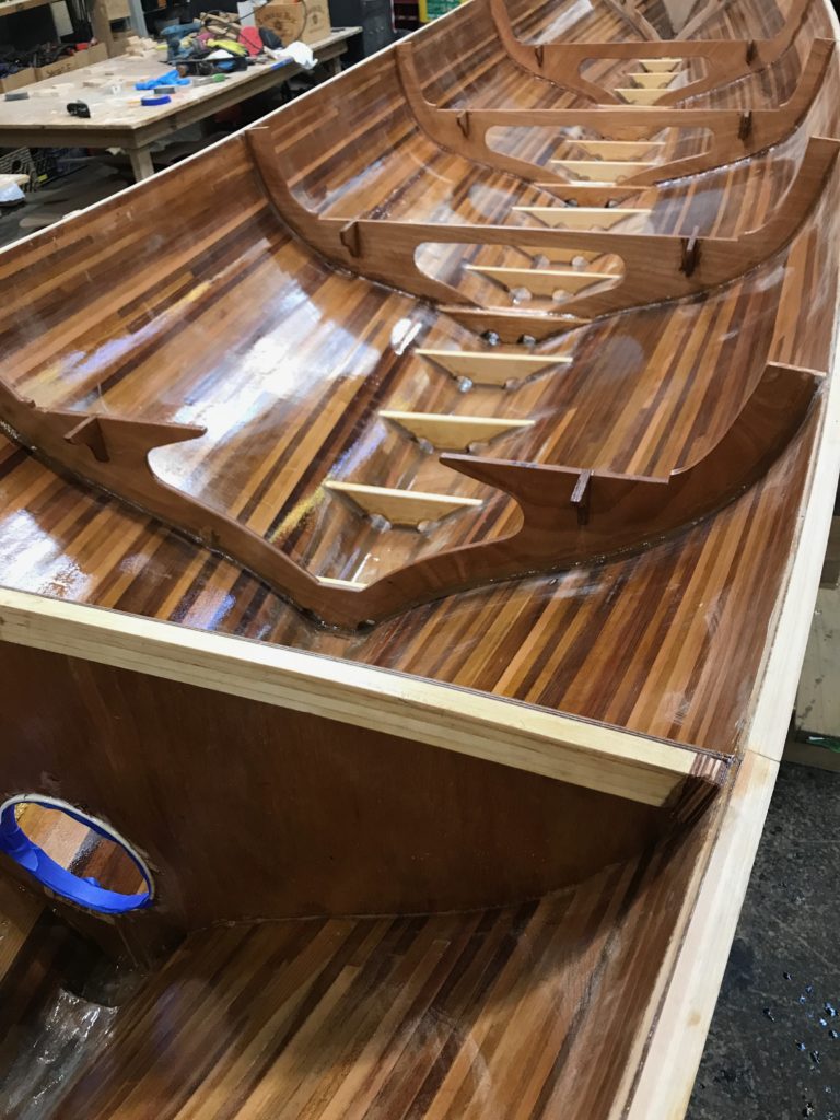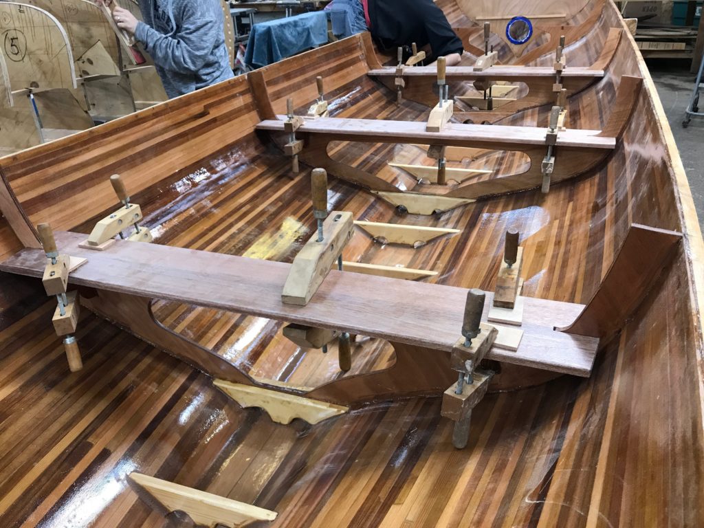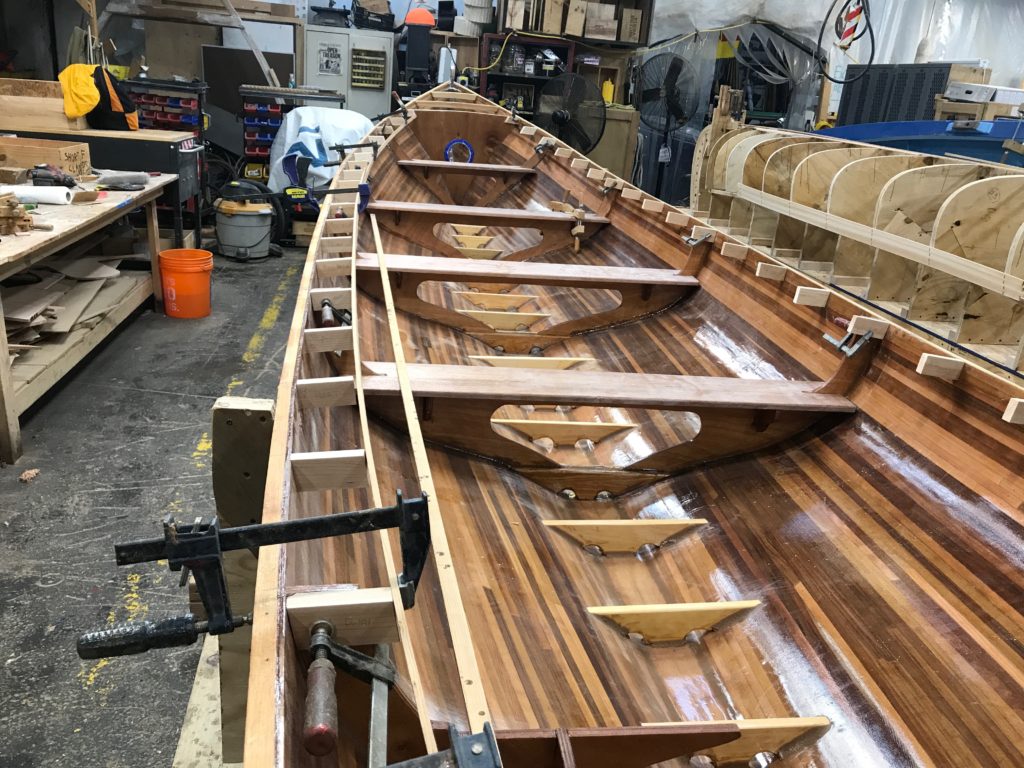 The DTH gig has been fully planked (with red cedar strips) and fiberglassed (inside and out). We have also inserted frames (to support the seats) and floors (to support the floorboards) as well as bulkheads fore and aft. This week we installed four beautiful mahogany seats. Then we set to work on the wide gunwales that will anchor the oarlocks. We may end up painting part of the DTH–discussions are lively on this subject!–but we are working carefully to ensure that if we want to simply varnish the whole craft it will look absolutely ship-shape.