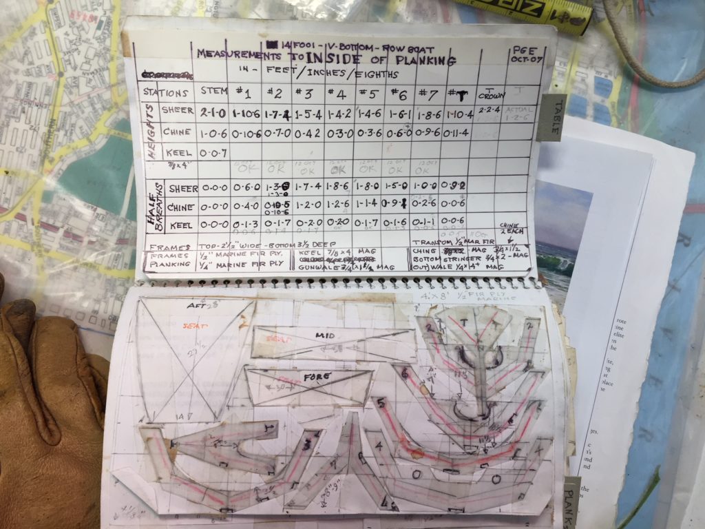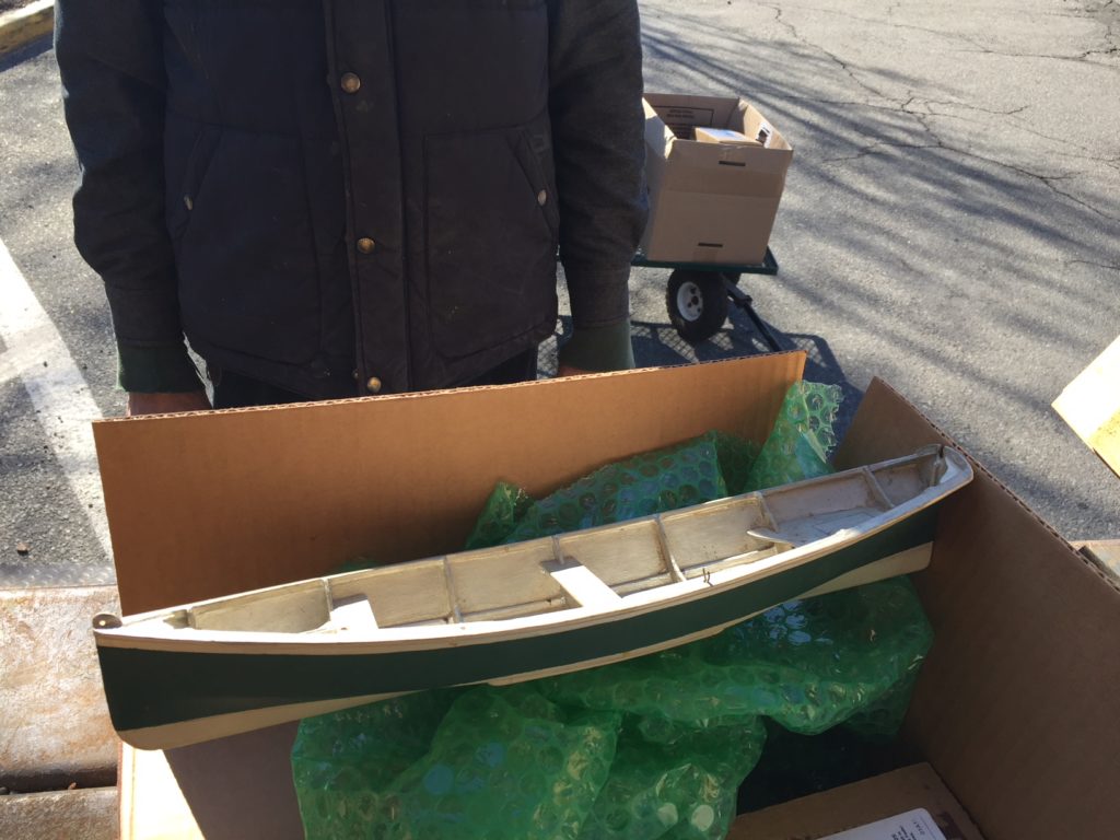 In February, Rob rented a truck and drove out to Muncy to pick up the strongback and frame of the boat, to which some temporary plank patterns had been clamped. Along with the oars, planking stock, assorted tools and some nautical books, Carolyn donated a beautiful model of the boat and Paul’s notebook detailing every step in the boat’s design and construction.