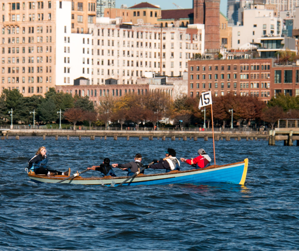 The river race started in the embayment, left it to head north against the ebb tide, to a turn boat stationed approximately a half-mile north of Pier 40, and returned to cross the finish line inside the embayment. Seven crews participated in this timed race with a staggered start. There was a last-minute substitution because one of the winning crews from the first event (the perimeter loop) had left early. So Sound School substituted its female crew, the Bombshells. Winners of the river race were: first place Harbor School’s Harbor Lambs, second place Cortlandt’s Big Boys, third place Sound School’s Golden Age.