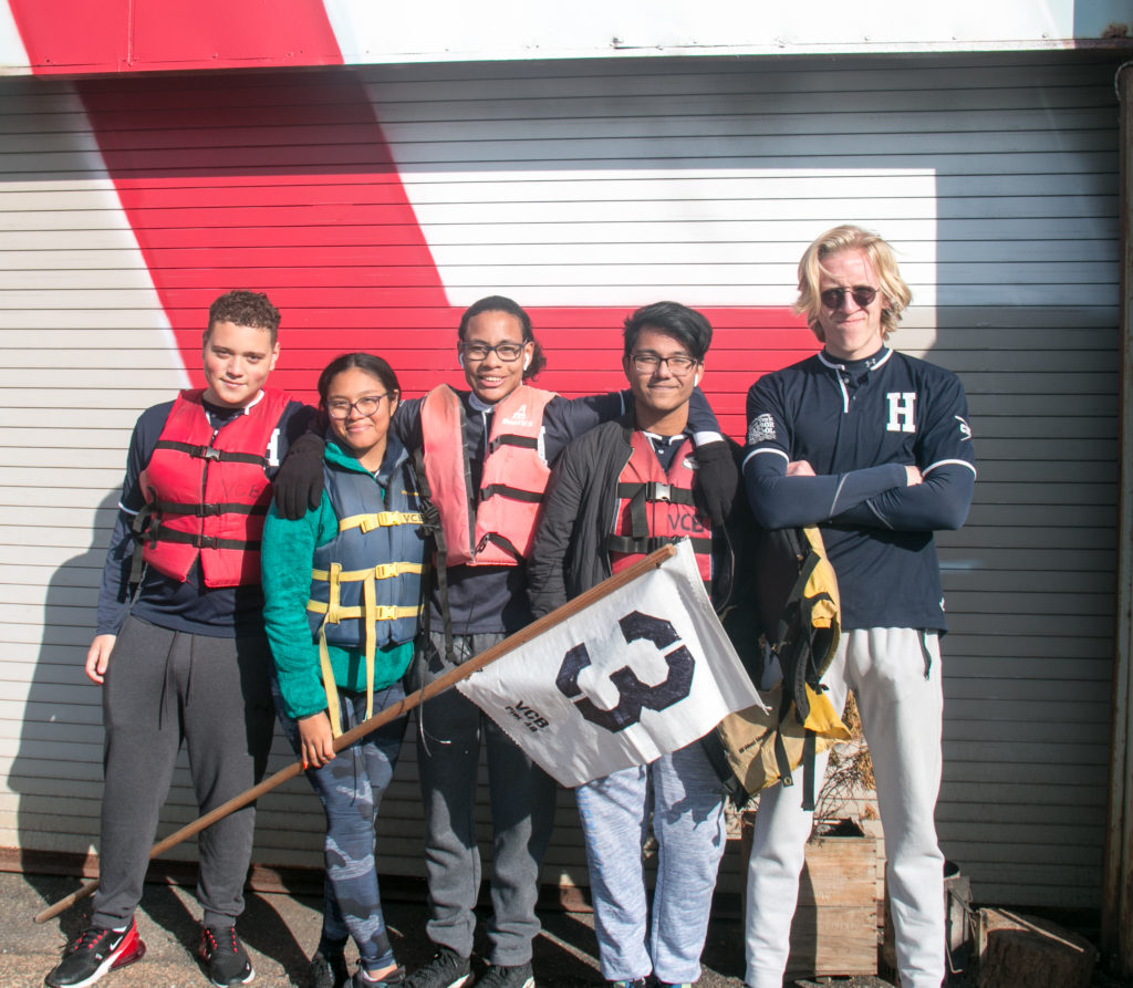 Coaches, parents, and VCB volunteers crowded the south walkway and cheered on the teams. We estimate that 160 attended the races, including the participants. Frank Cervi provided breakfast coffee and bagels. Dave Clayton had prepared number flags, and the arriving crews were invited to individualize their flags with markers. At the end of the day, they would take their flags home. Sally Curtis and Ruth Lindner had loaded up Sally’s large SUV with hot dogs, burgers, rolls, snacks, etc. the day before. Soup and salad contributions rolled in. Lorne Swarthout manned the barbecue grill with help from Bob and Dave (we think from Sound School). Paul Caviano set up the scoreboard and kept the score brilliantly. Michael Anton provided his ever-witty announcements. Deborah Clearman organized the timekeepers: herself, Ruth Lindner, Lee Berman, and Derek Wollenstein. This year we had two timekeepers per boat, to guard against stopwatch failure and human error. For the river race, we asked for volunteers to provide 14 timekeepers. Seth Rivera, Pablo Garcia, and Kristina Allocco acted as line handlers, helping crews in and out of boats at the floating dock.