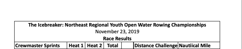 On November 23rd, Village Community Boathouse (VCB) sent two crews and a gig to Fort Point Channel in Boston to compete in the Northeast Regional Youth Open Water Rowing Championships, aka Icebreaker. Hosted by The Hull Lifesaving Museum, the race included more than 250 middle school and high school participants. Beginning with heats in the channel, the event culminated in the Nautical Mile race in the harbor.