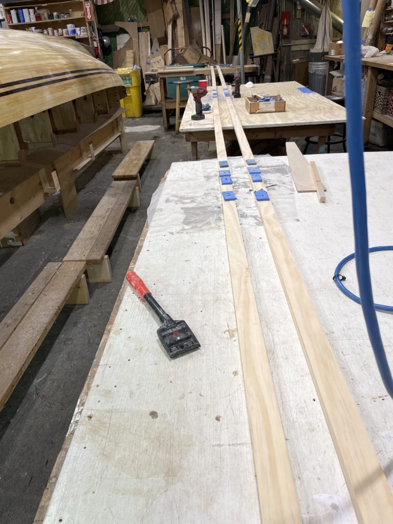 That step will be adding a robust gunwale strip to both sides of the hull. There are two 3/4 x 1 3/4 x 28′ pine strips prepared for us to bend and clamp and screw and glue into place on Sunday.