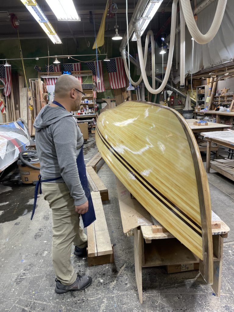 That will be an inner gunwale, and it will be covered with a 1/4″ of mahogany later on. In the meantime, it will give a lot of stiffness to our eggshell hull when we lift it off.