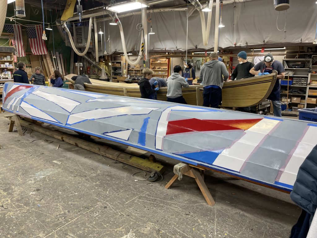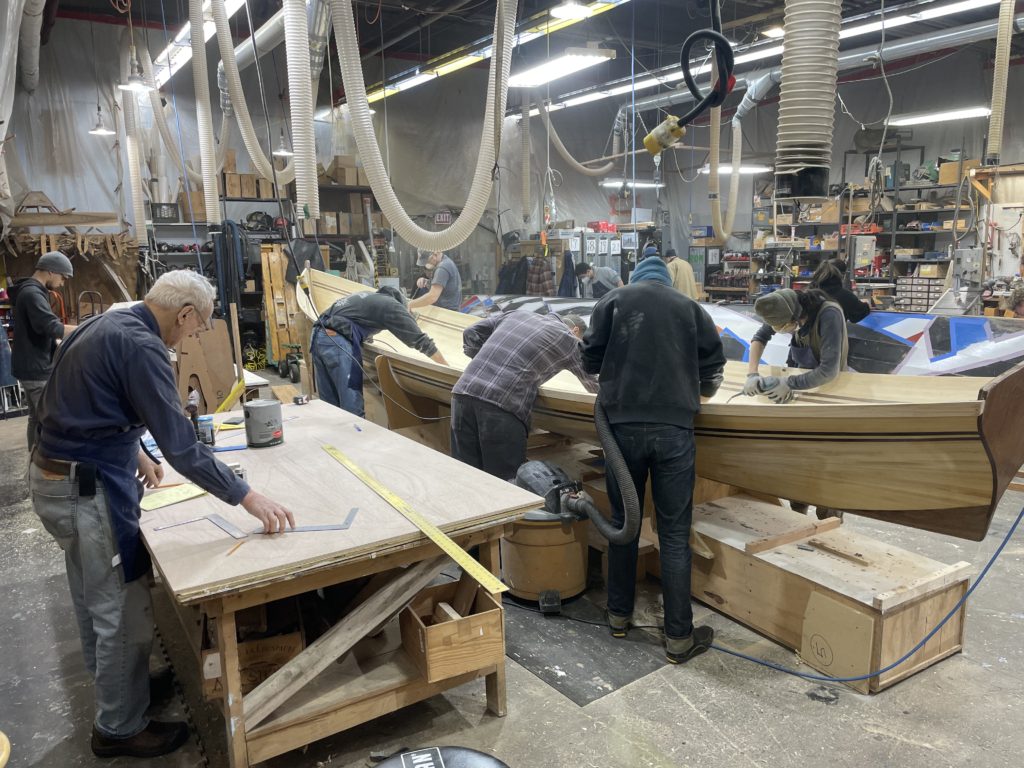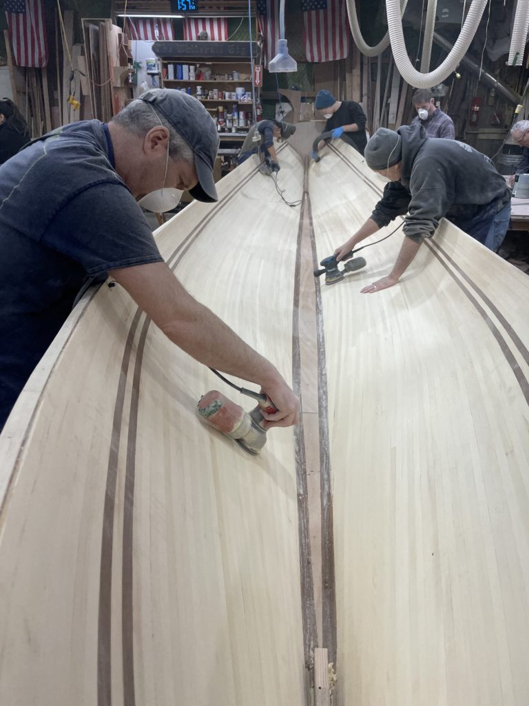 In addition to polishing the inside of our cedar eggshell, we also ran some epoxy fillets to reinforce corners, shaped the top of the stem, and trimmed a handsome curve across the transom. Once the fiberglass is complete we will be making ribs and floors and decks. We have begun laying these out.