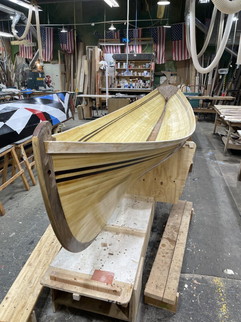 On Sunday a nimble crew of VCB volunteers laid the last length of glass cloth inside the new gig. While David P and Dan patiently rolled the thick molasses-like epoxy into the cloth, Elys, David B, Ruth, Jack, and Aidan carefully scraped up the excess juice until the cloth was saturated and tight to the boat.