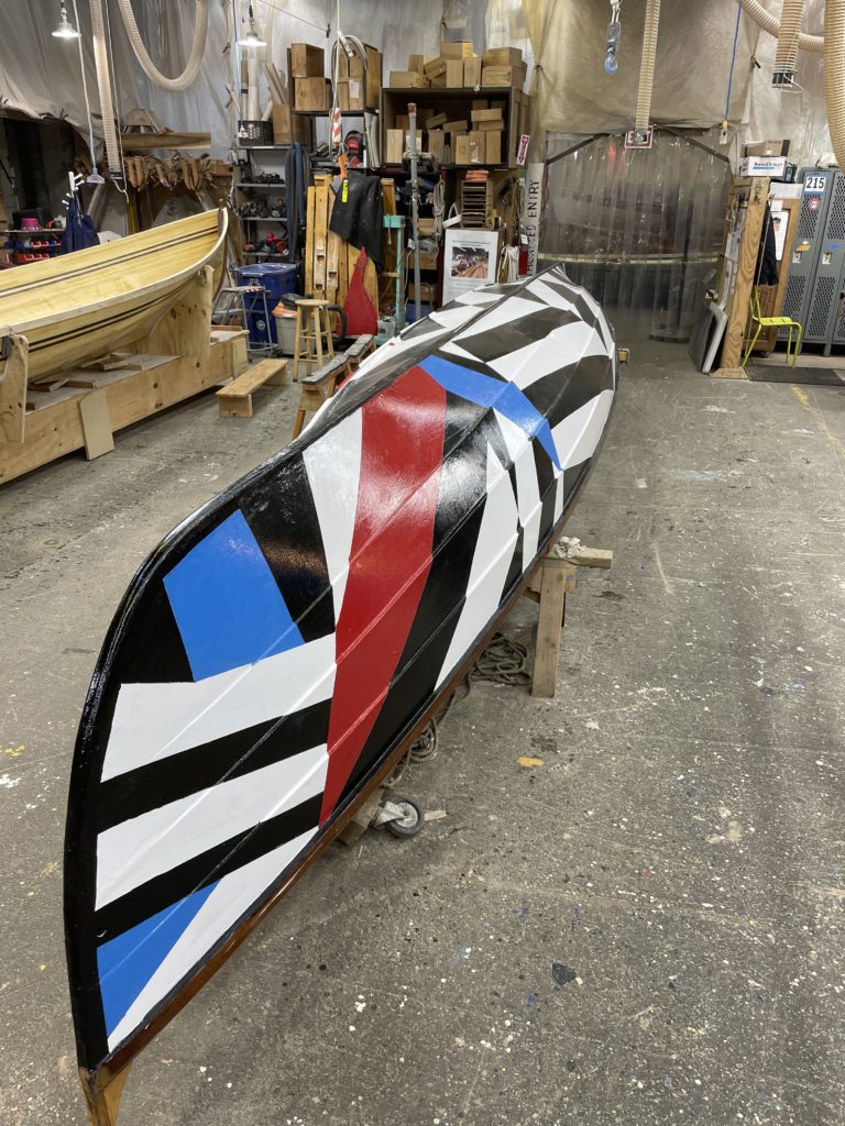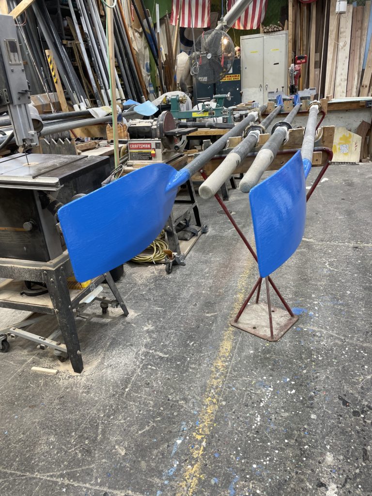 The painters were at work also. The razzle-dazzle finish on King Tide is finally looking like it is done, and the Pete Seeger oars are getting the Ukrainian blue and yellow treatment.