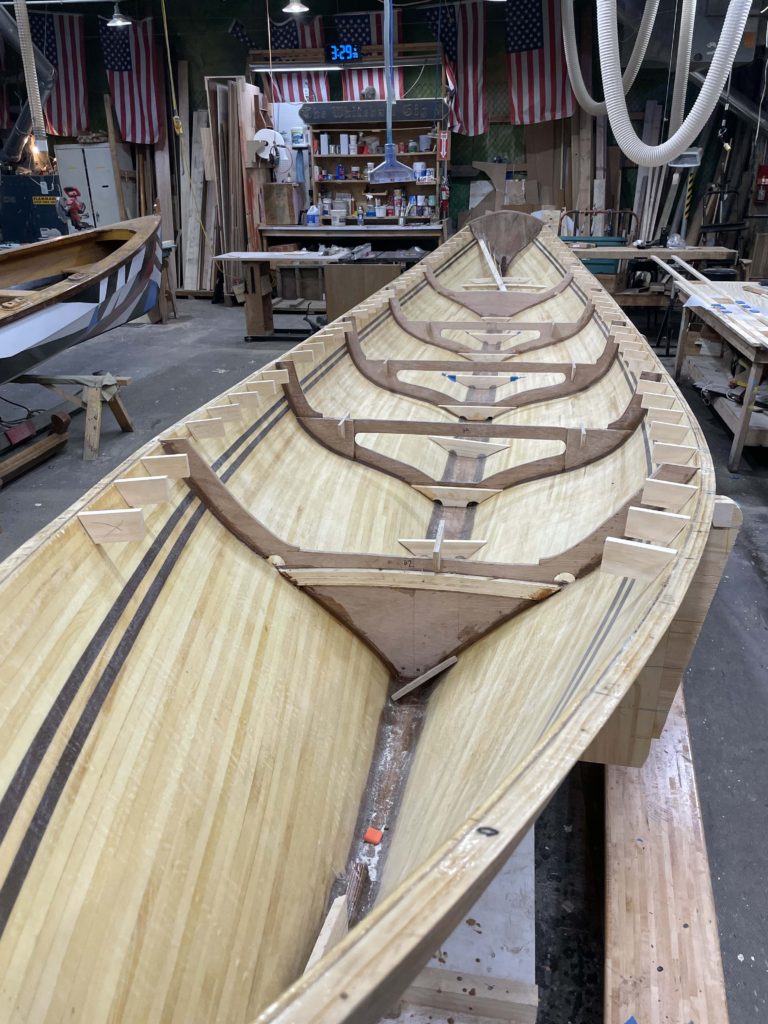 One of the things we talked about as we worked with dark epoxy “peanut butter” on our blond cedar gig on Sunday was “working clean.” This is the practice of taking extra care when working on a project that will end up with a clear finish. If your boat is going to get painted, glue stains are not so important. But if the goal is to show off the beauty of the natural wood, a glue stain prevented (or quickly wiped up) means some tedious sanding has been prevented. We have been taking care to “work clean”, and as a result our gig is not only going to be fast, it’s going to be lovely as well.