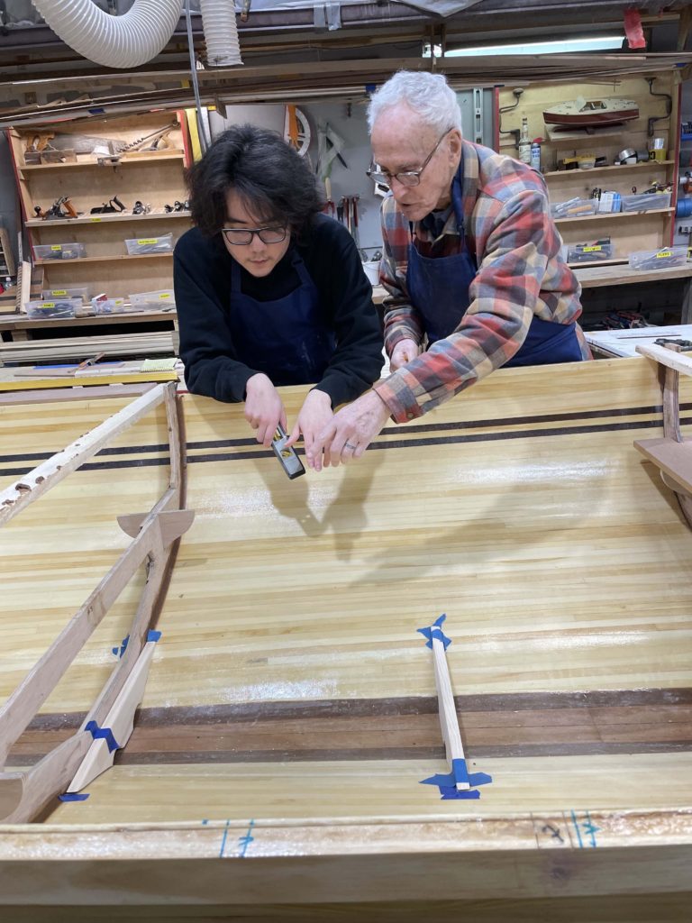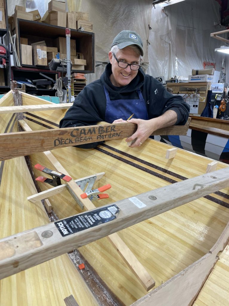 On Sunday an active group gathered for what Ruth once called “boat church.” We tackled a variety of projects from a brass stem band for King Tide to coxswain rails to shop clean-up. But our main task was fitting out the interior of our new gig. We glued new frames and floors in place, sanded mahogany seats, and cut and fit more than 70 deck beams. You can see the results in the photos below.