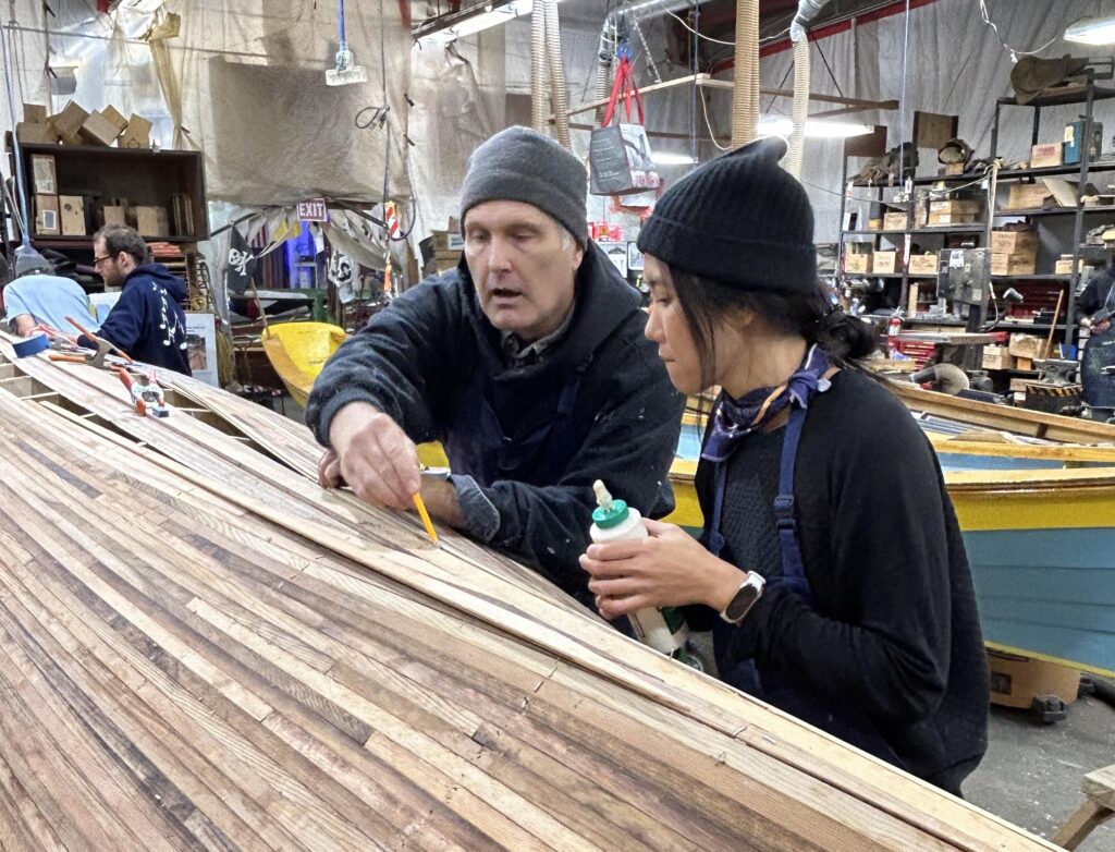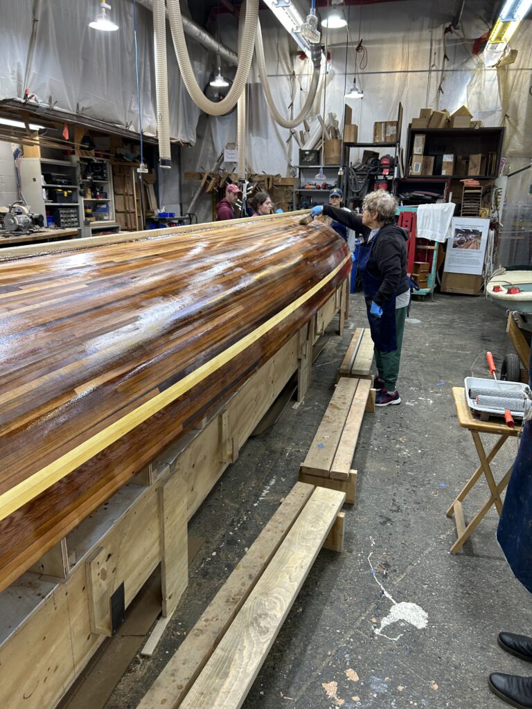 On Sunday the volunteer boatbuilders of VCB laid the last strip on our new American Star. The hull is now complete. Over 3,000 strips of western red cedar (and a dozen of Alaskan yellow cedar) have been carefully glued together over the last three months to form the long, sinuous hull that will become the newest custom wooden boat to emerge from the VCB workshop.