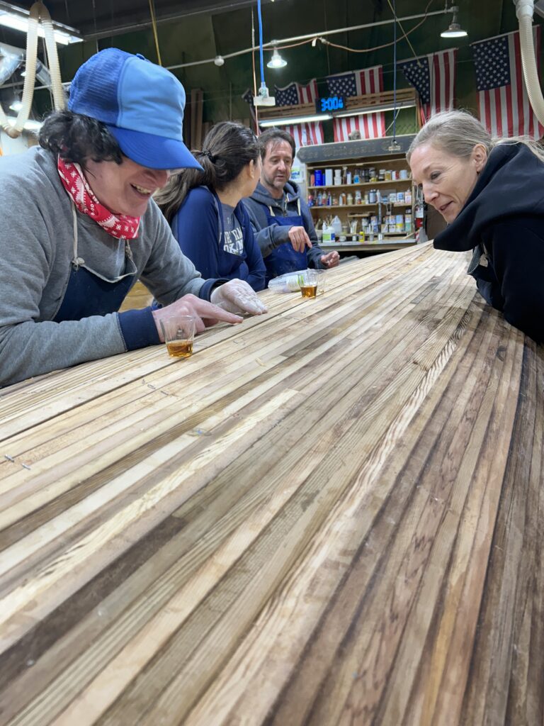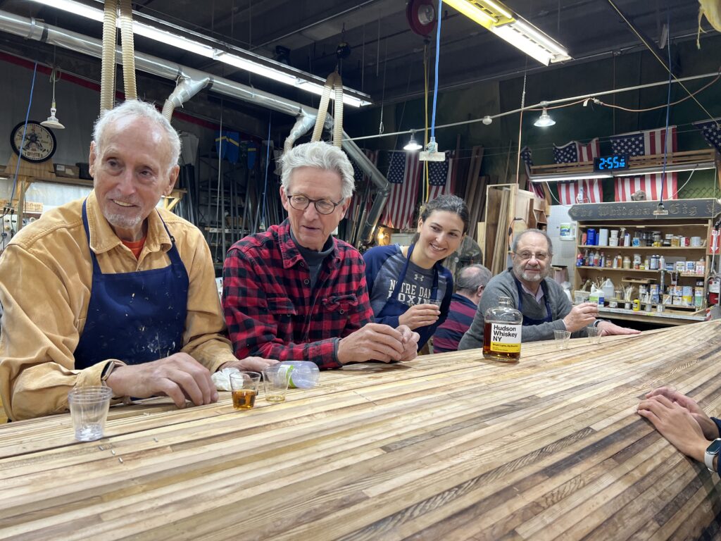 We all celebrated, as is traditional, with a whiskey toast. This was not a boat launch, which is usually celebrated with champagne for the swells, but a big moment for the workers who know what has gone into getting the boat to this point. They have turned a pile of sticks and boards into a beautiful, organic thing. It is a moment worth savoring and deserves a toast.
