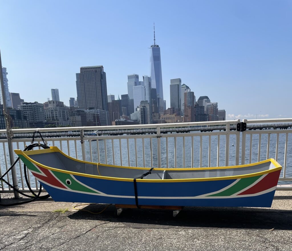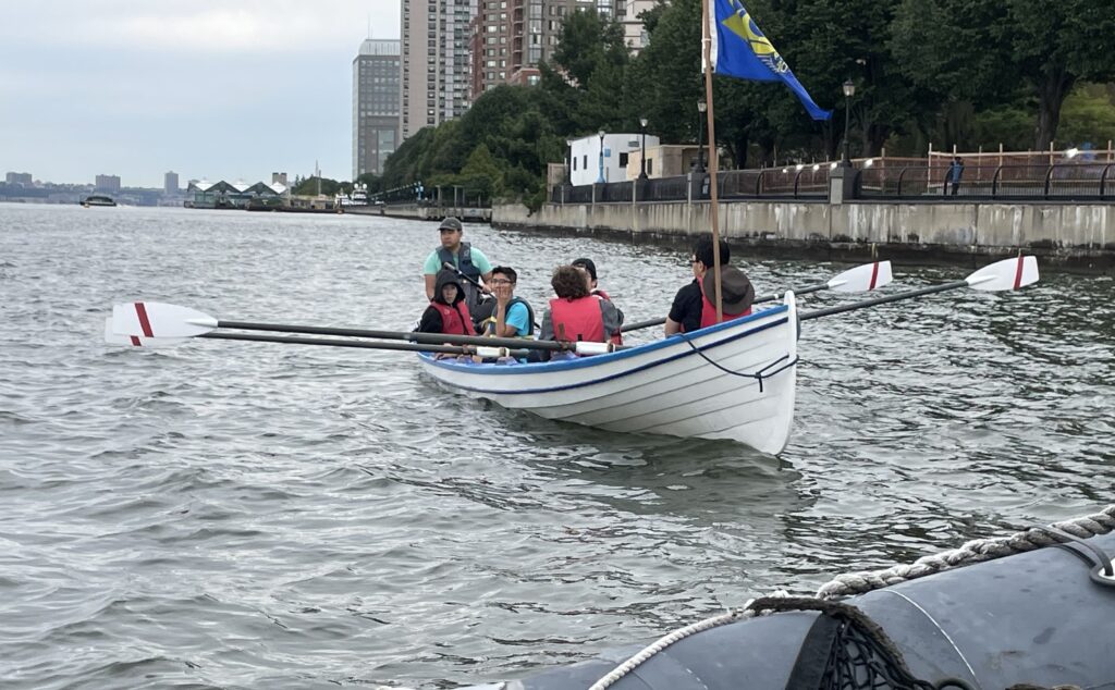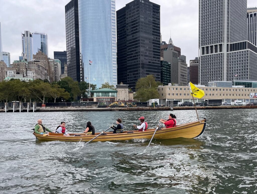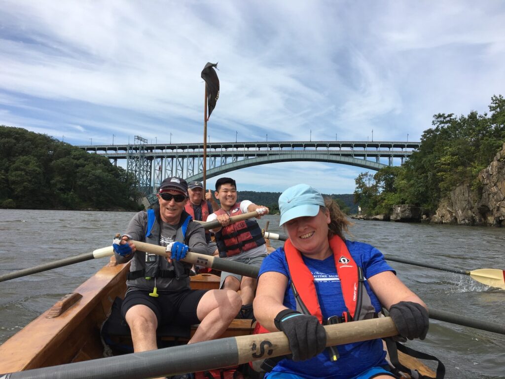 Thank you to everyone who donated to our Row Around Manhattan on September 16. Despite forecasts of high winds and storm surges, 45 voyagers set out in eight boats from Pier 40 at dawn last Saturday, expecting a sea of whitecaps. Fortunately, Hurricane Lee held off and cool weather made for ideal rowing conditions, with very little boat traffic on the East River. Three members of my crew were from Open Water Rowing at Hull Lifesaving Museum outside of Boston, making their first circumnavigation of Manhattan–and for one, her first trip to New York City. They enjoyed seeing the city from a unique perspective, very different from coastal New England. They were also powerful rowers and our boat Notorious led the pack.
