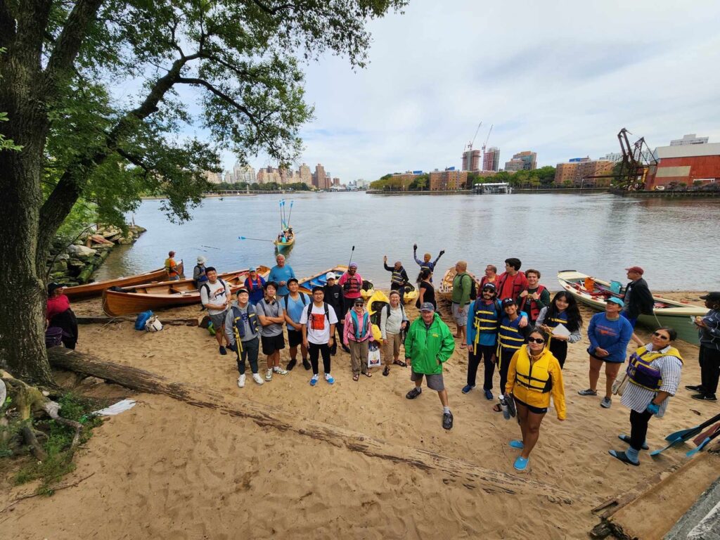 We were greeted at Halletts Cove in Queens by the kayakers of LIC Community Boathouse—enough room on the tiny beach for all! The sun came out as we rowed up the Harlem River and ducked under the Spuyten Duyvil rail bridge. With the northwest wind at our backs, we sailed down the Hudson and made it home to Pier 40 ahead of schedule.