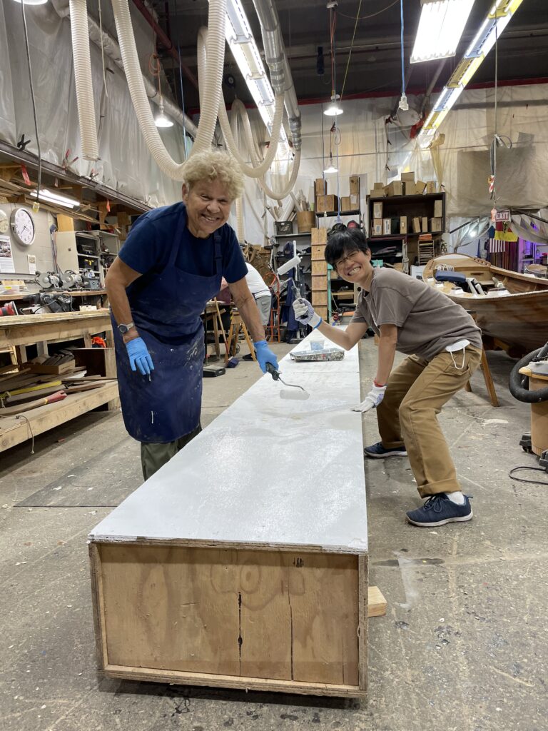 Exhibit director Wei Du had the idea for an orchid boat modeled on a Taiwanese fishing craft, and he found us after a short Google search for “boatbuilders.” Andrew and I went out to Flushing to see him. It looked to be a straightforward project, we had time, a price was agreed on, and we got to work. We did our best to imitate a couple of photos of actual Taiwanese fishing boats. The result was a very elementary shape with a very exotic paint pattern.