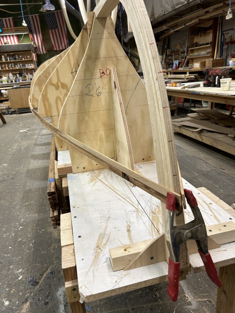 We have finally finished the form and skeleton on which we will build our American Star. All 17 molds have been molded, the stems have been steamed and bent, and the keel has been beveled.
