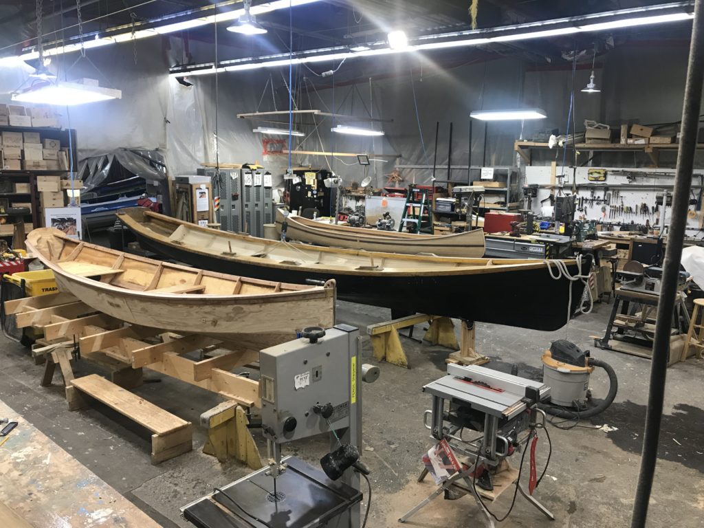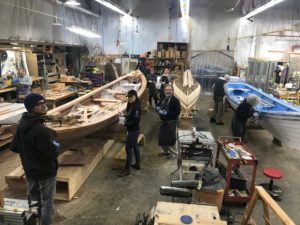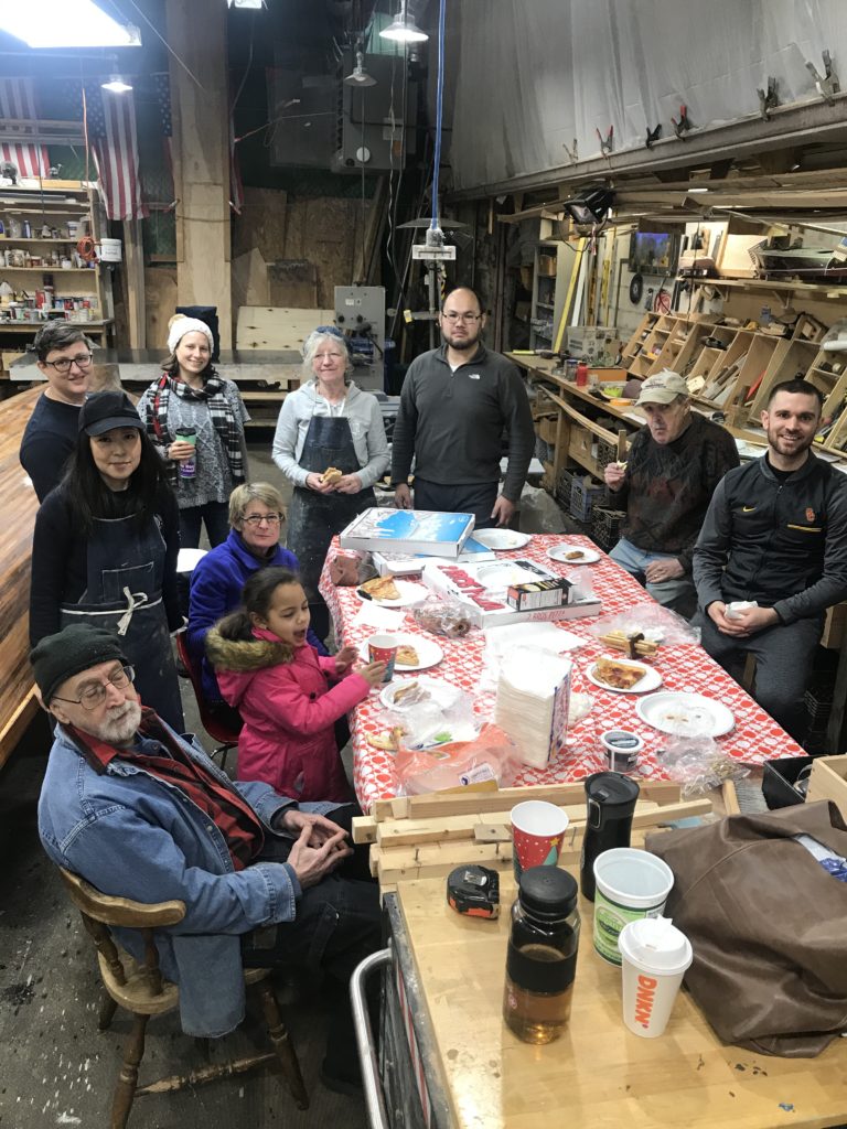 At 2:00 the boatbuilding crew stops for lunch. Improvements in both heating and lighting this spring have been much appreciated.