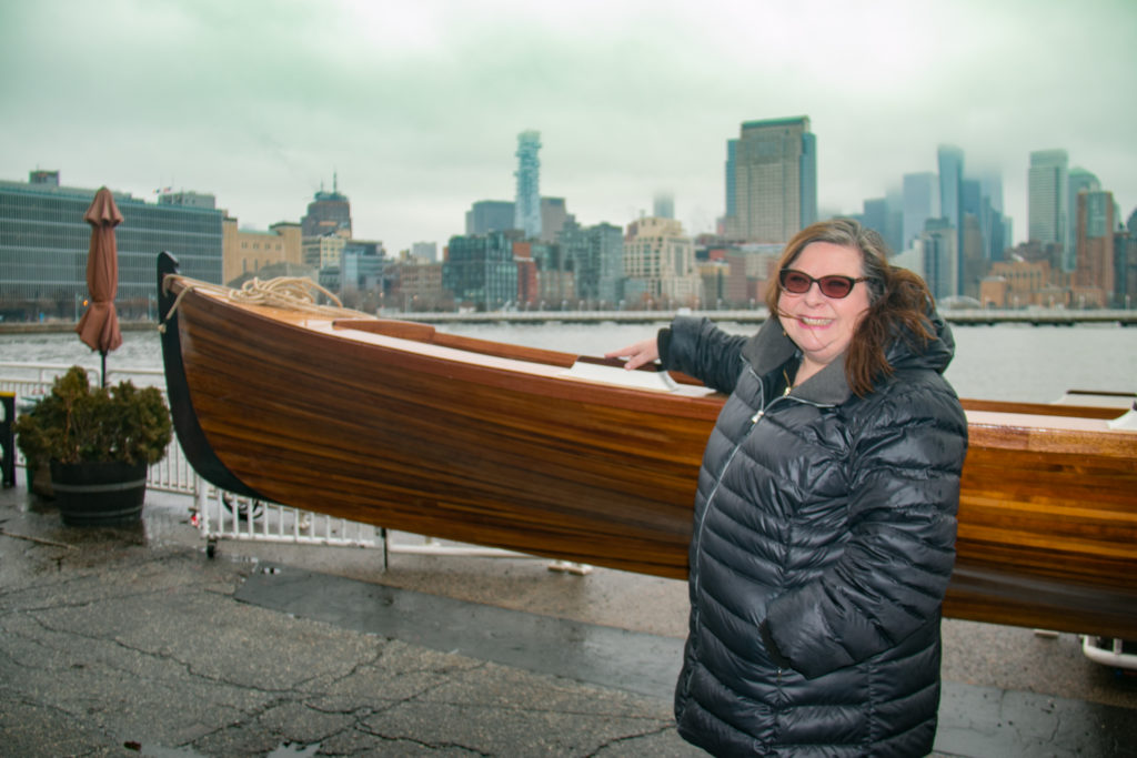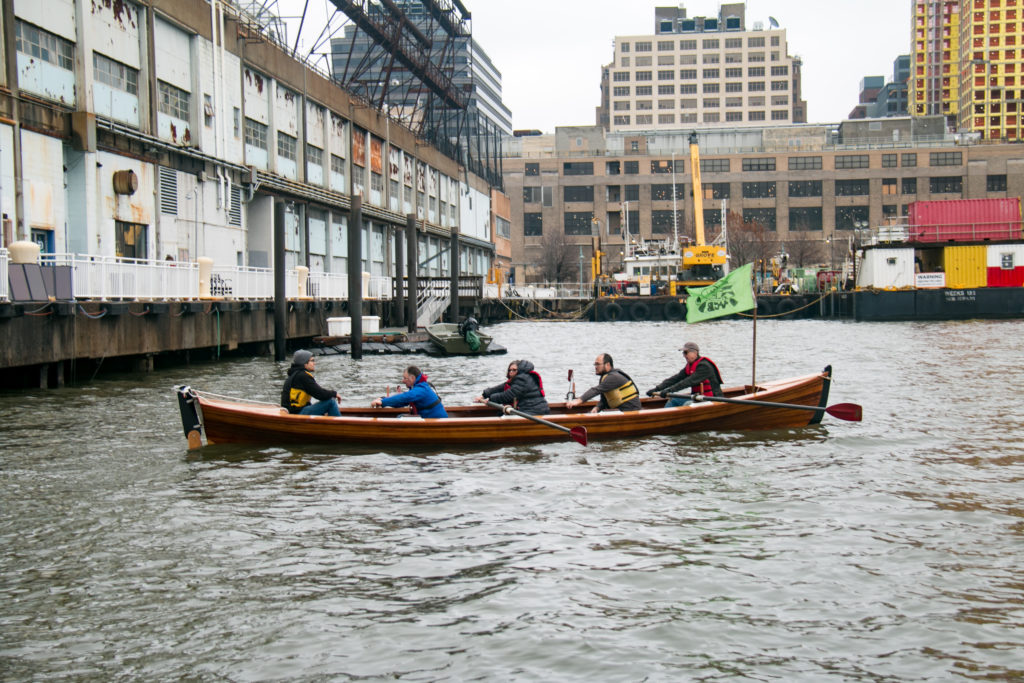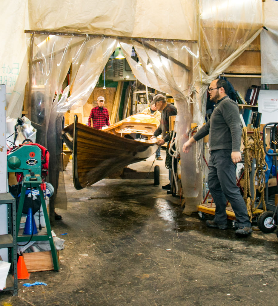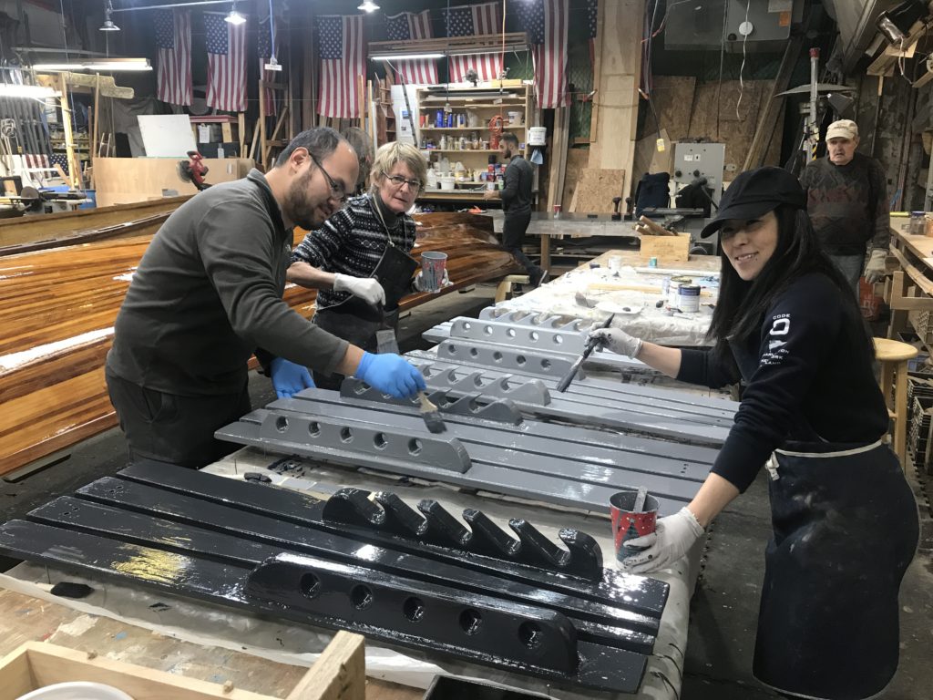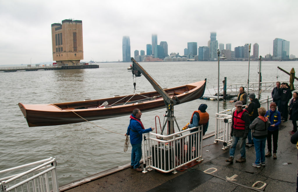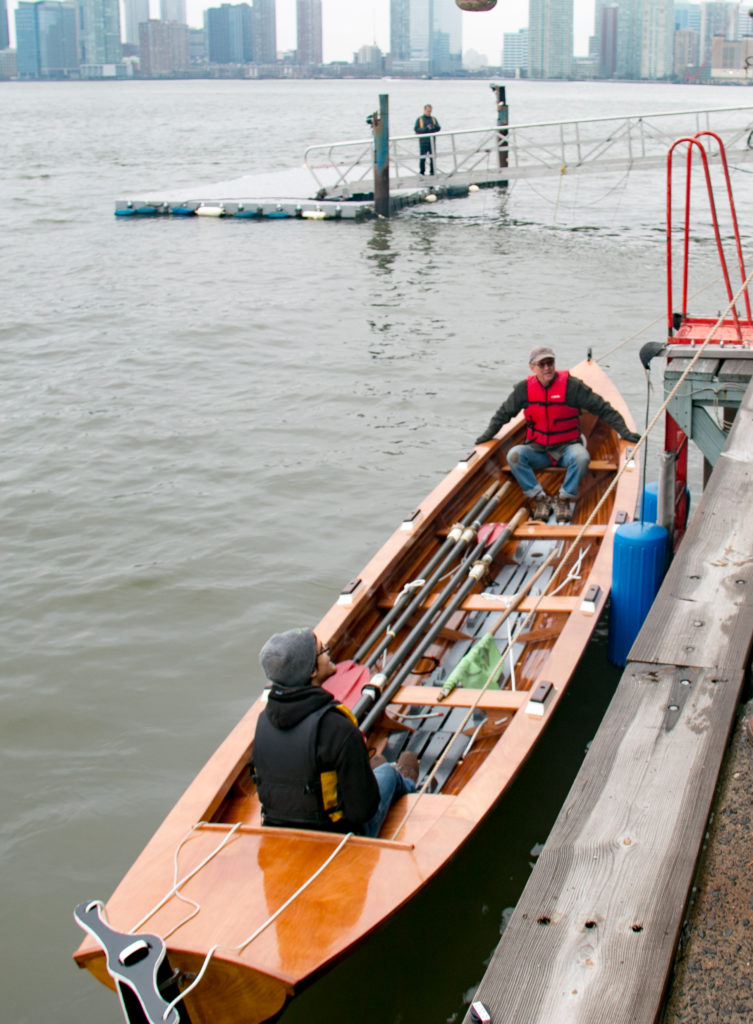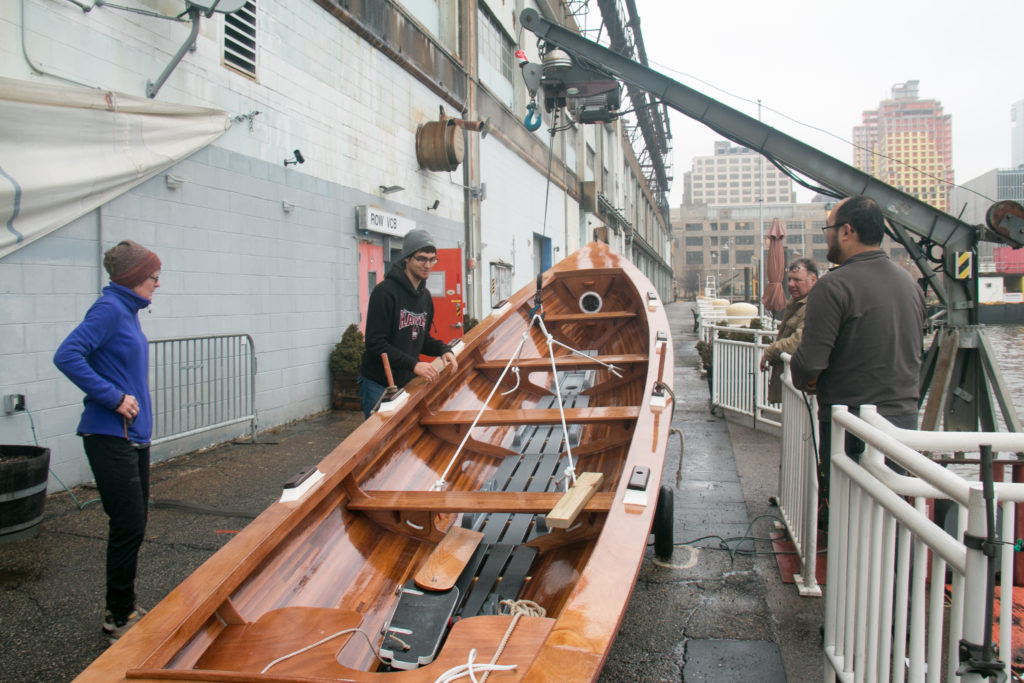 Our newest Whitehall gig, David T. Heim, slipped into the Hudson just in time for a ride up to Hull, Massachusetts for the annual Snow Row. Here we are stretching a protective rope bumper around the Heim. We want to keep the woodwork looking good for as long as possible!