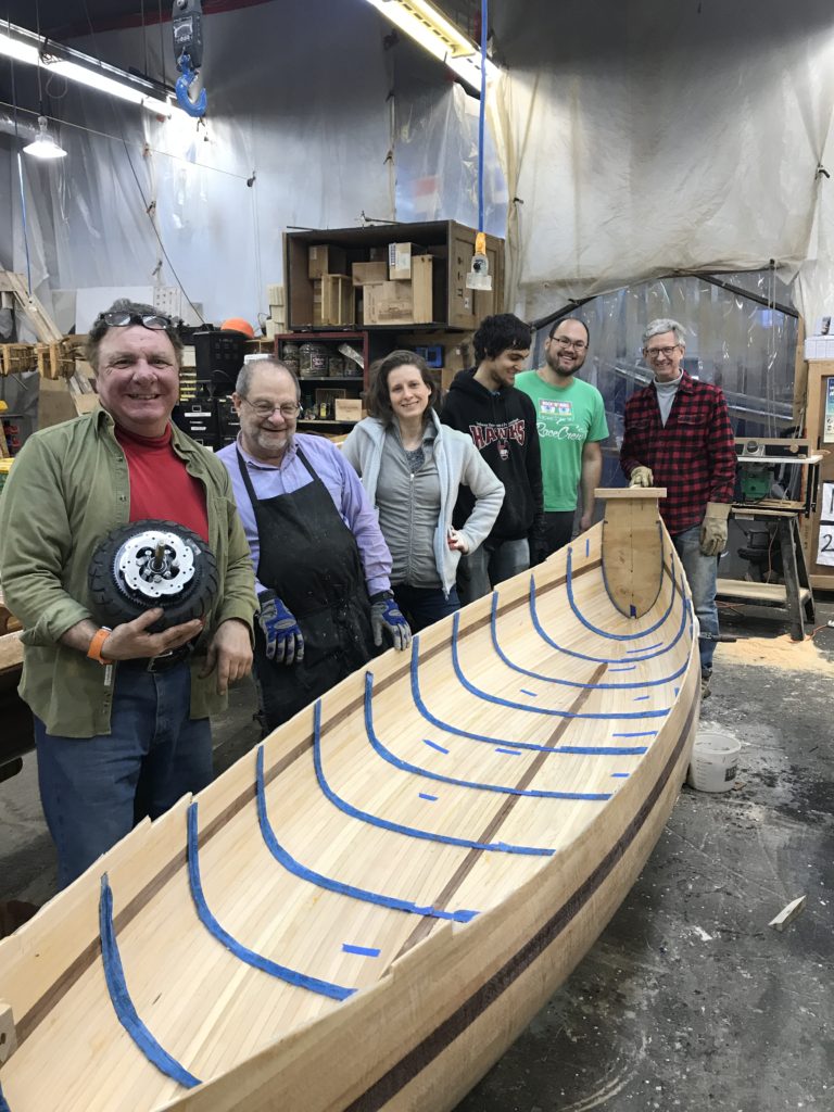 This has been a busy spring of boatbuilding on Pier 40. Here are six volunteers who worked on the new canoe. It has just come off the forms. An exciting moment!