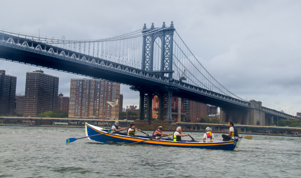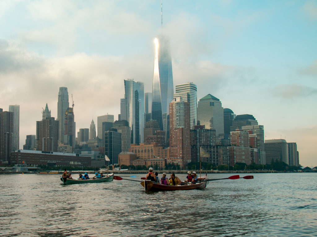 On September 11, 2021, thirty-two intrepid rowers circumnavigated the island of Manhattan in six Whitehall Gigs. The Row Around Manhattan (RAM) is an annual Fall fundraising event for Village Community Boathouse and each rower contributed a minimum of $100. The RAM is a challenging and incredibly scenic 30-mile voyage that begins at our boathouse on the south side of Pier 40, circles Manhattan on the Hudson, East and Harlem Rivers in a counter-clockwise direction, and ends with a spectacular party back at the boathouse.