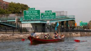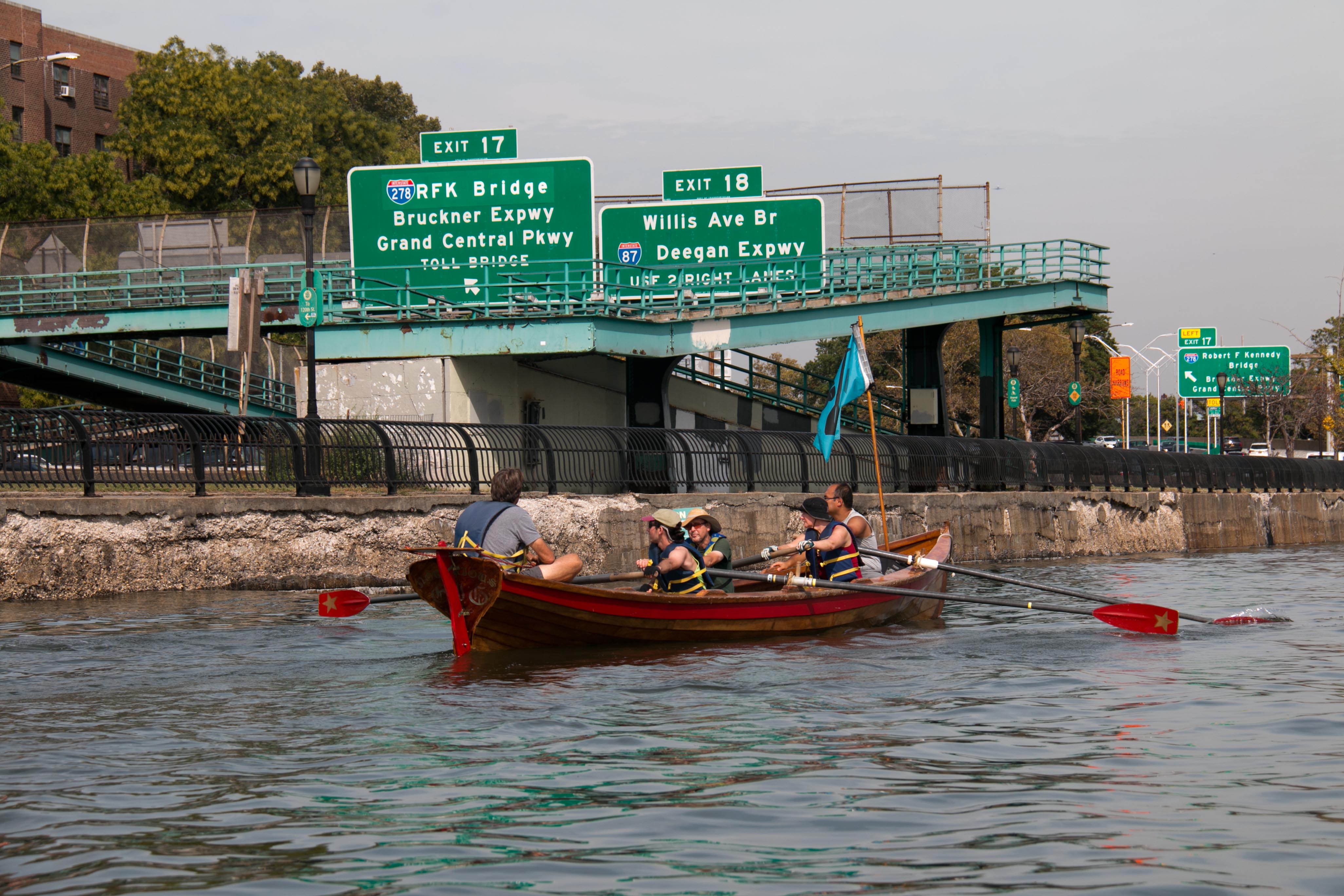 We enjoyed the placid waters of the Harlem River, counting the bridges we rowed under. There are 21 in the whole circumnavigation. Along the Harlem we passed the picturesque Peter Jay Sharp Boathouse, home of Row New York, and several inviting homeless camps tucked along the wooded shoreline.